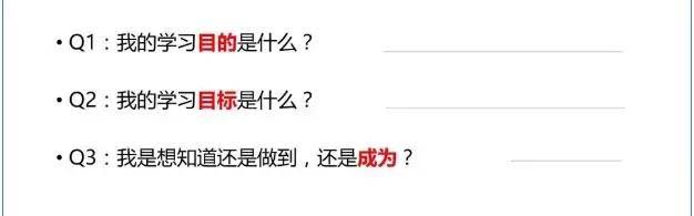 學習的目的,是關于動機,就是我為什么要學?你是要知道還是做到,你是要成為還是要相信,還是擁有?到底是學以致知,還是學以致用,還是學以致富呢?我來學習是為了讓自己多一些炫耀的談資,還是讓自己做出一些改變,還是讓這些改變讓自己受益,或者能夠解決問題?而學習的目標是什么?就是你渴望未來有什么樣的結果?比如一個月,100天的學習結束之后,你希望自己成為一個什么樣的人,在這個過程中能收獲到什么?對你的人生將產生什么樣的改變?目的和目標是有非常大的不同的,目標是關于你目的的一種呈現,它是指成果,而成果必須通過行動來實現。所以你報任何一個課程,不用心學,只是停留在聽一聽看一看的層面,只是想希望通過浮光掠影的方式去獲得你想要的,這怎么可能呢?