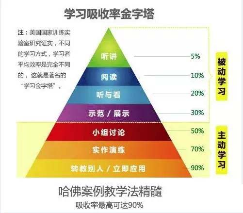 很多訓練實驗室研究證實,不同的學習方式,學習者平均效率是完全不同的,這就是著名的“學習金字塔”。通過“教別人”或者“馬上應用”,可以記住90%的學習內容。